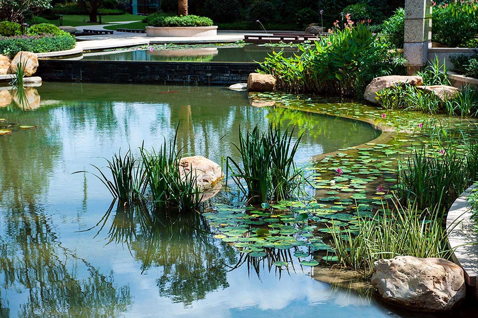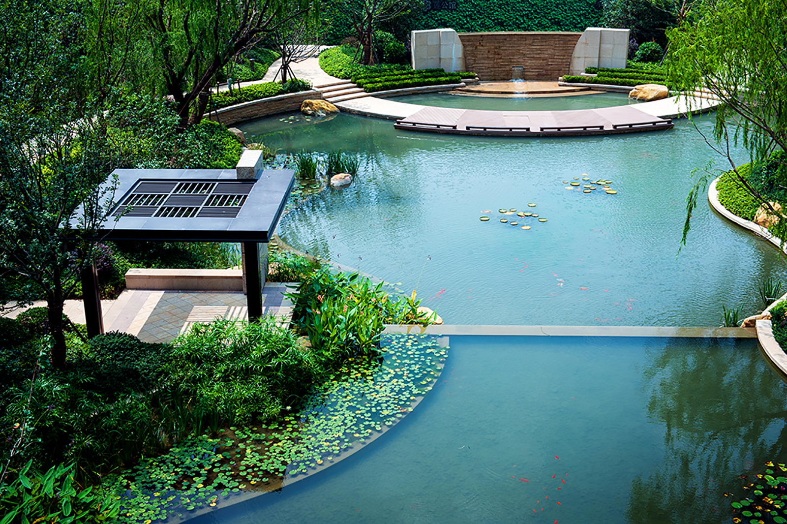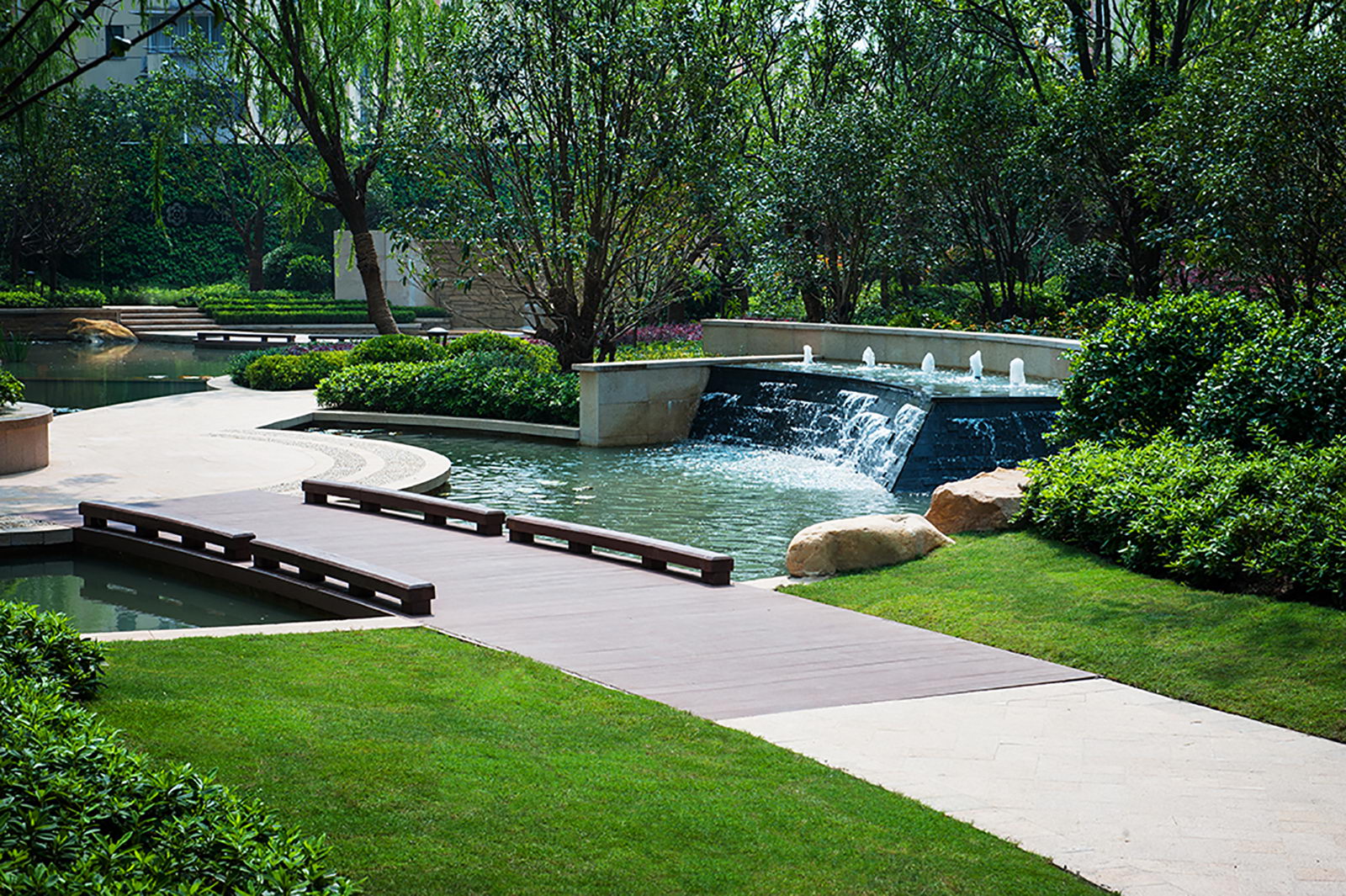 整個小區(qū)的景觀設(shè)計在當時借鑒日本人居設(shè)計思想,樓盤的總體定位即以高雅、藝術(shù)、自然共生為理念,融入精巧設(shè)計,對景觀細節(jié)進行了一一呈現(xiàn),疊石理水,以“水岸共生、居隱書香”為主題,構(gòu)筑蘊涵傳統(tǒng)園林的空間布局和現(xiàn)代園林精華的景觀環(huán)境。