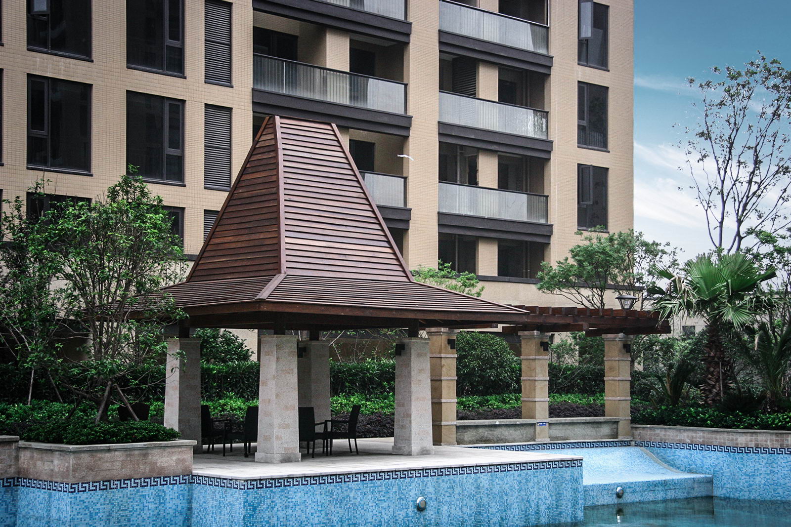優雅的度假泳池,每到夏令時,吸引業主紛紛走出室內空調房,投身到蔚藍水世界,放松身心。