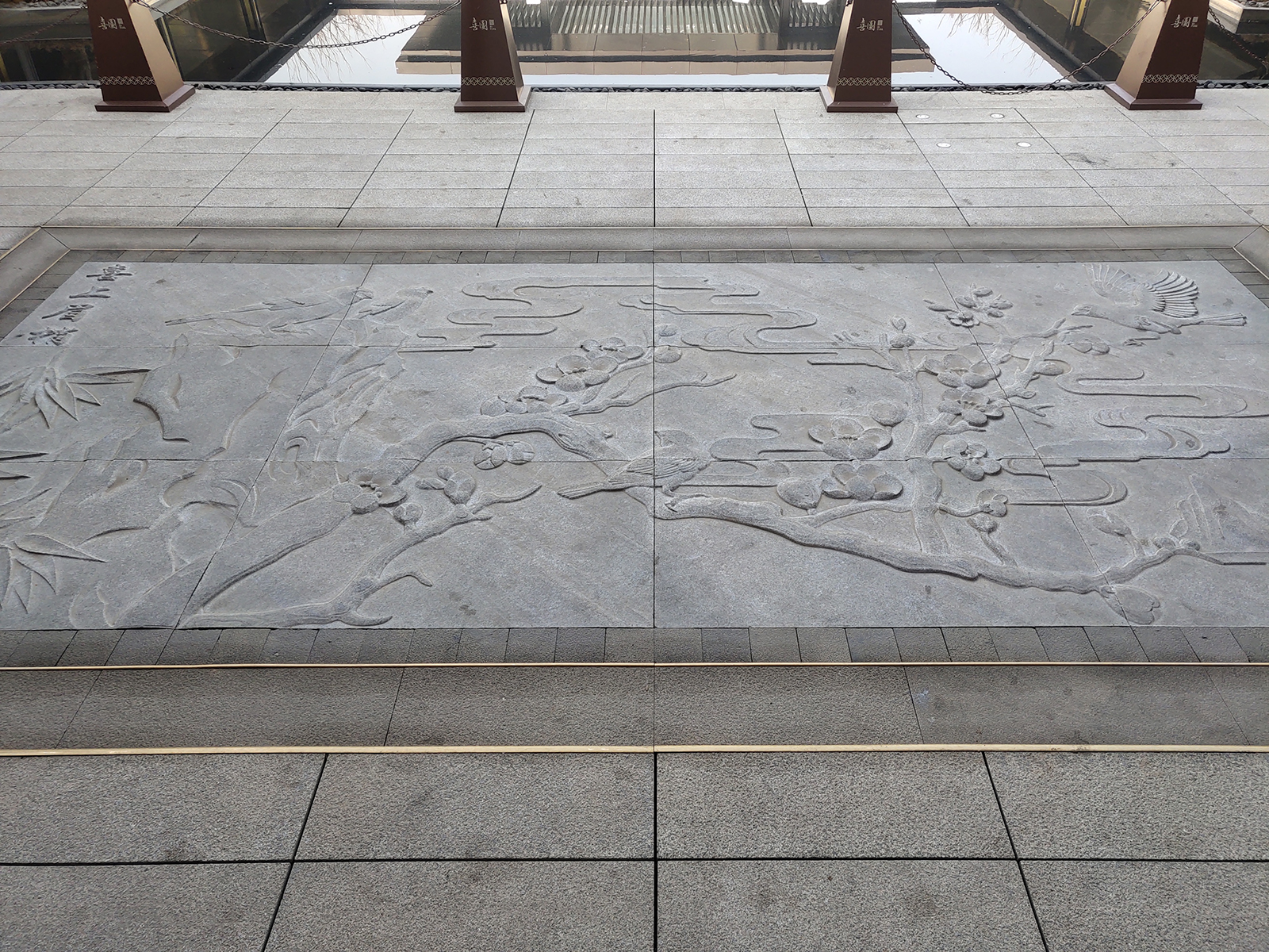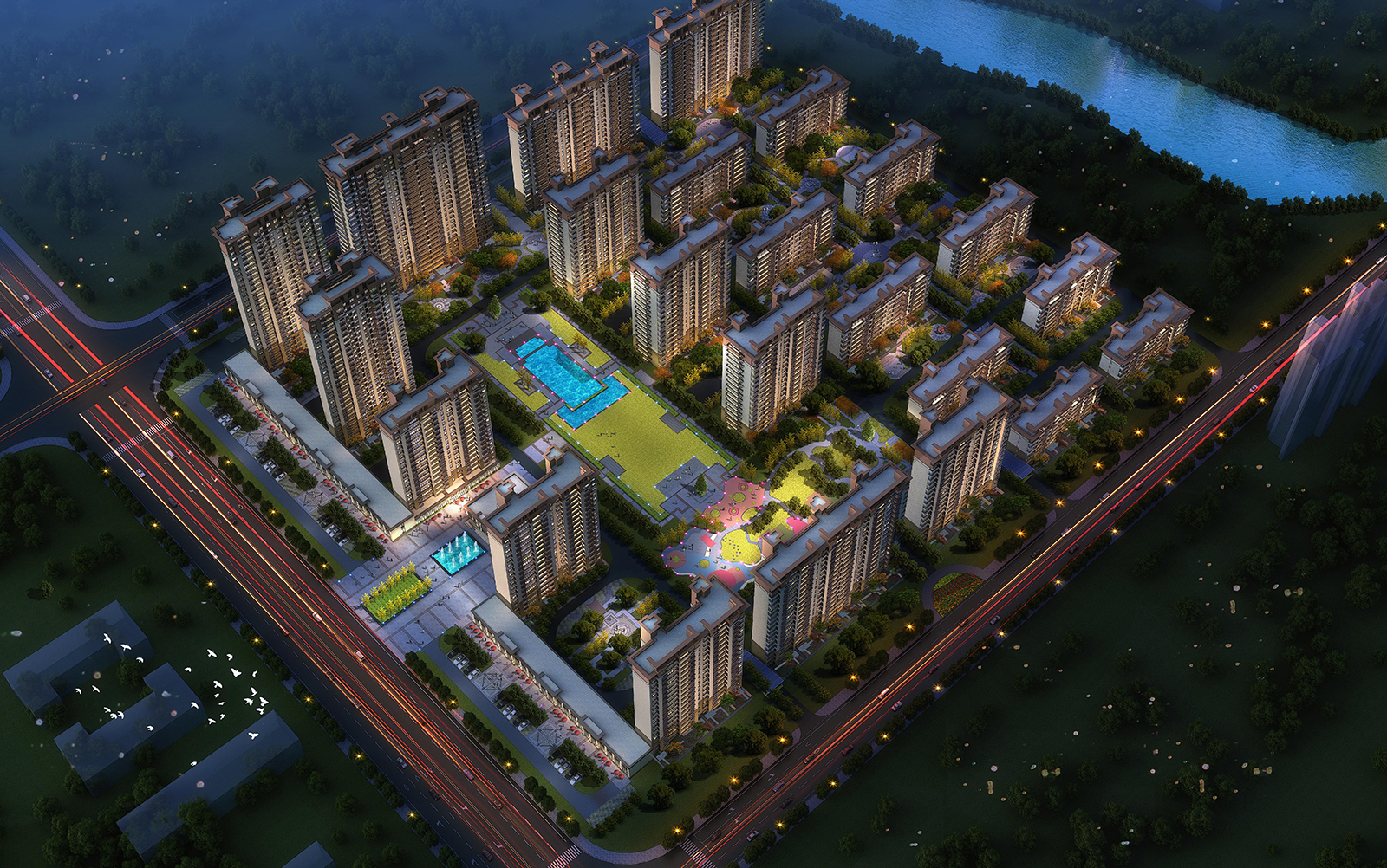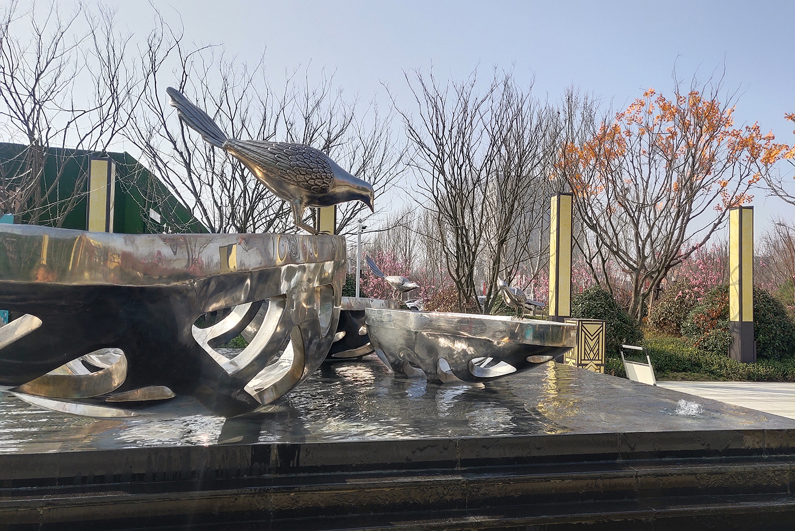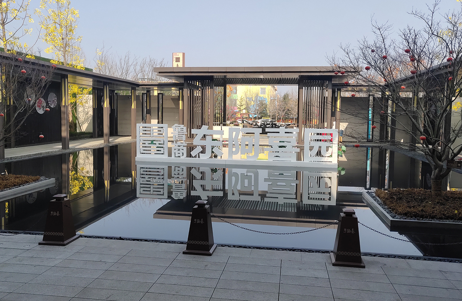 前場(chǎng)采用一禮(有鵲歸巢)、二迎(百鵲來(lái)迎)、三境(鵲廊鏡水)設(shè)計(jì)手法,入口禮儀廣場(chǎng)、景觀燈柱禮賓歸家,百鵲來(lái)迎景墻引導(dǎo)賓客進(jìn)入場(chǎng)景,通過風(fēng)雨連廊,見中軸線大尺度水景,藏風(fēng)納氣。水景大氣通透,煙波浩渺,禮儀燈光步道,靜謐舒心,大氣、精致、從容。