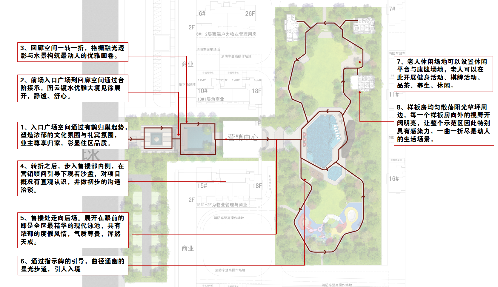 星光步道——曲徑通幽,兩側(cè)林蔭成趣,芳草鮮美,落英繽紛,自然引導(dǎo)客戶沿著精心設(shè)計(jì)的游線進(jìn)入下一個(gè)雅趣空間。