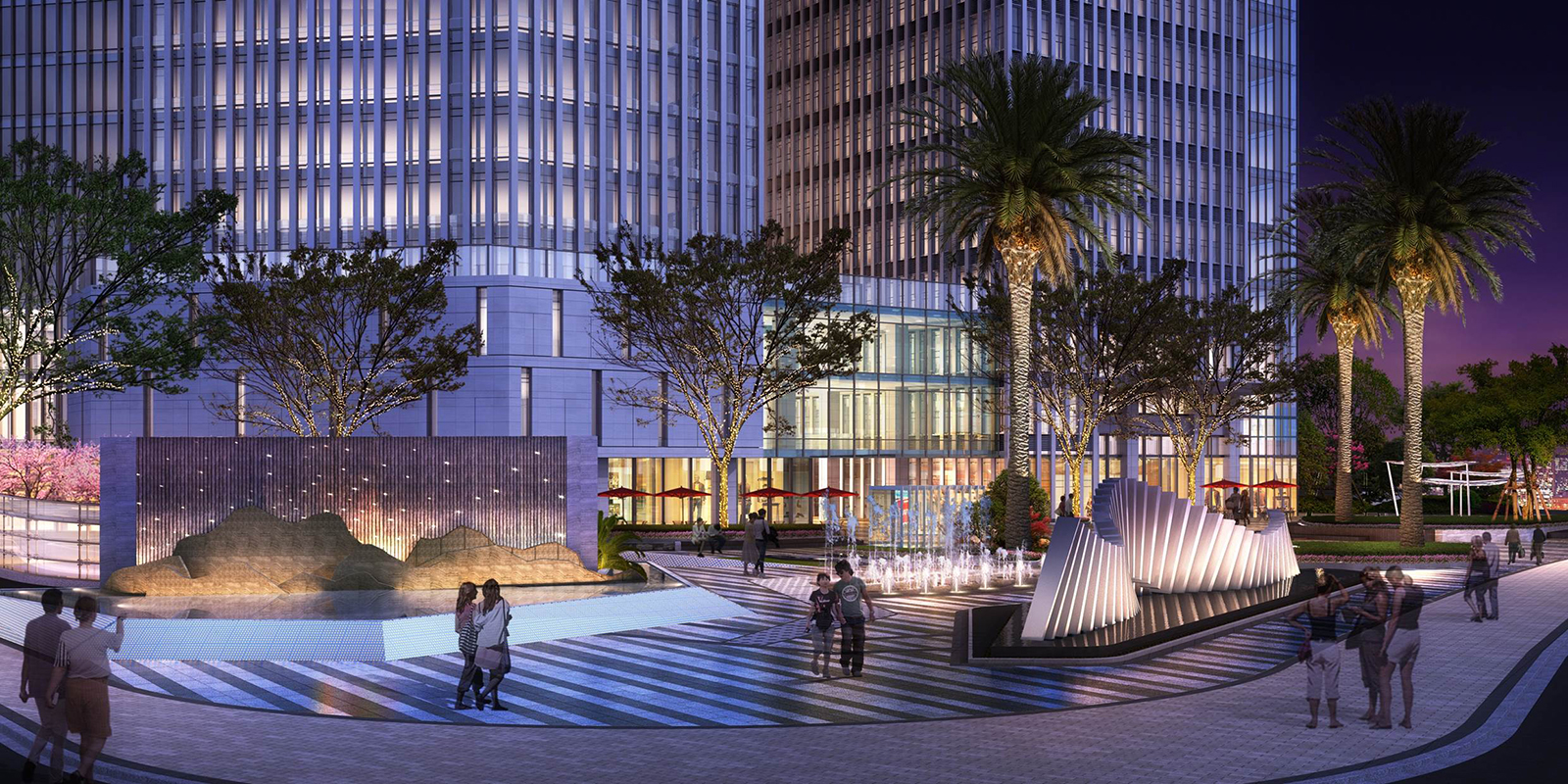 廣場界面以全新的手法演繹現代氣質,漢水之光異形景觀裝置,模擬流經尚水灣漢水水灣曲線,將放射線由低至高、前后倒匐、線性蜿蜒,曲線營造出獨有的韻律感,與漢江形成生動呼應人行走之間所見之狀隨之而變。