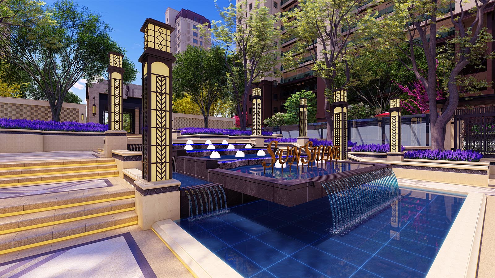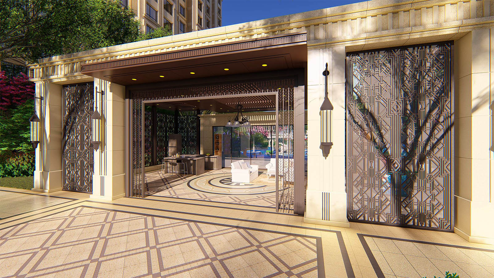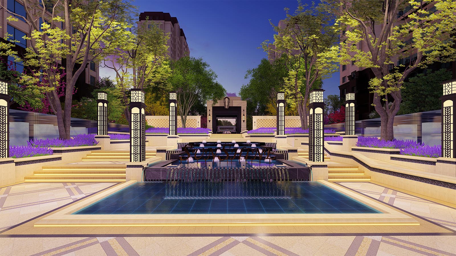 古典的中軸線配合精致的線腳,形式精美又富有力量,前廣場(chǎng)門頭雍容華美,入口對(duì)景層層疊疊水景精致動(dòng)人,引人入勝。