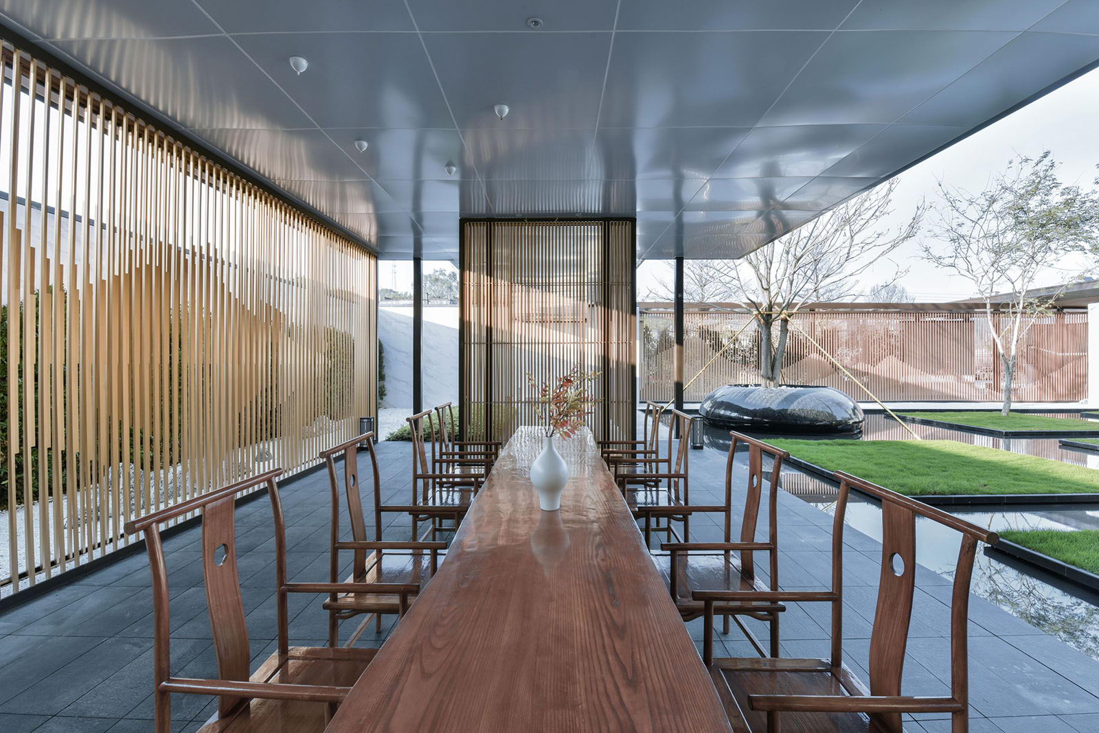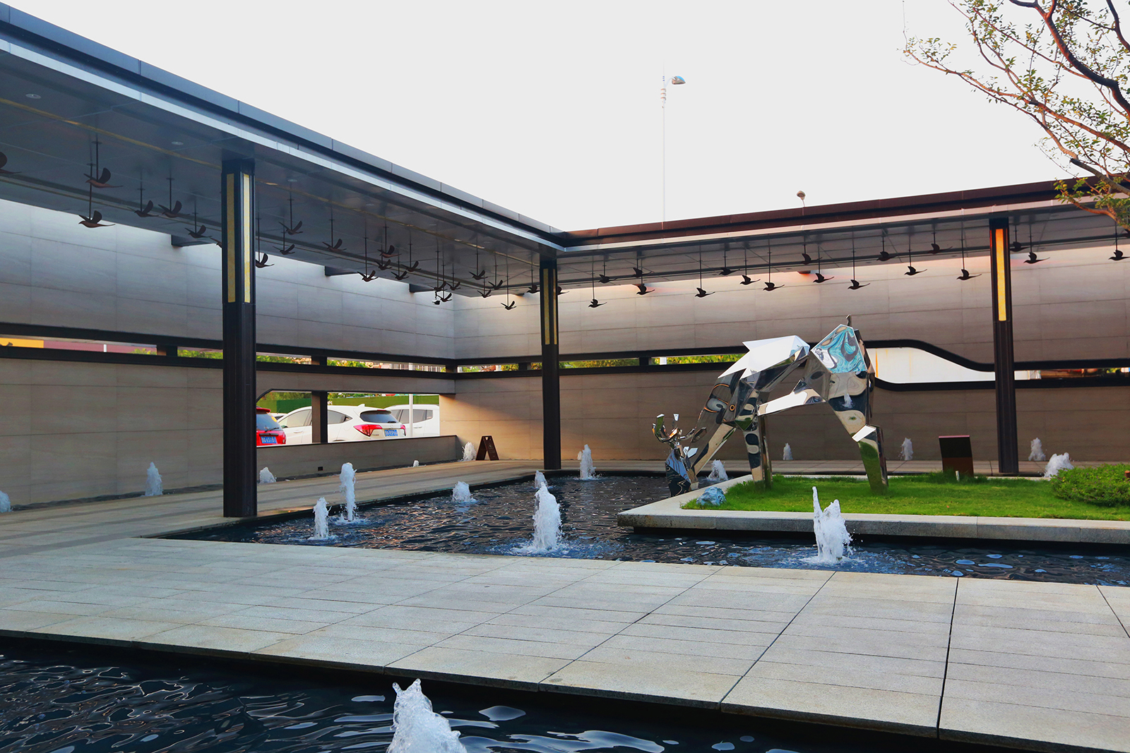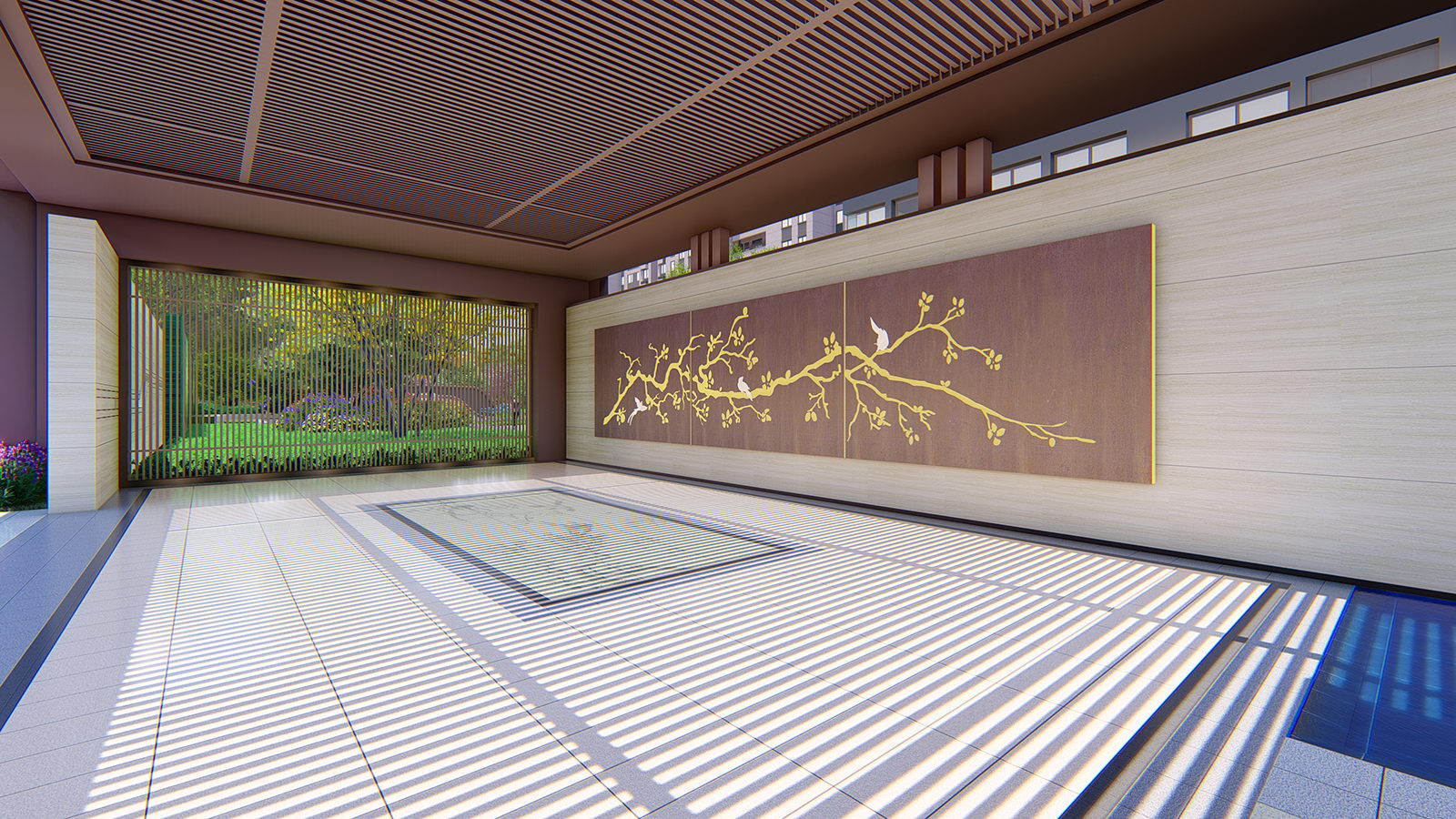 “L形”廊架給予客戶無形的引導,帶領客戶進入到更深層次空間,廊架頂板布置喜鵲藝術裝置,以雀幸喜歸為主題,引導賓客進入售樓部。