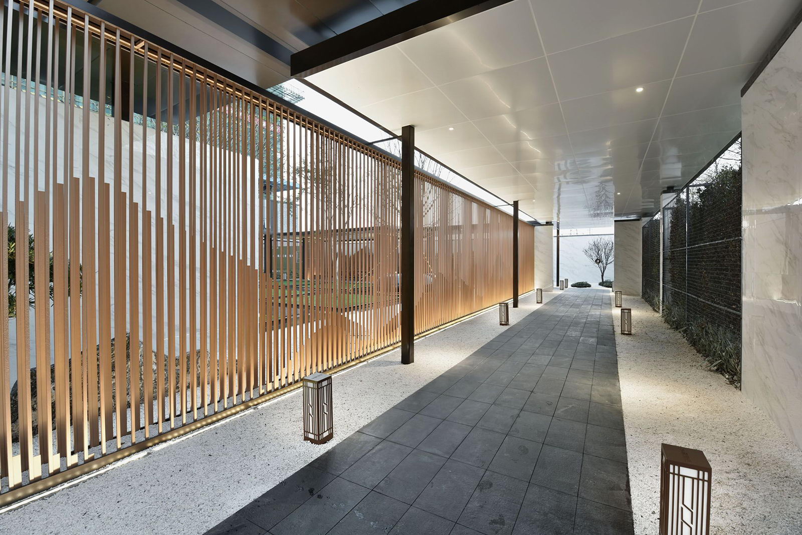 售樓部走出后園路上的對景,設置鵲影光華異形格柵景墻,優雅的光影關系,若隱若現的喜鵲小品,引導客戶進入景觀后場空間。