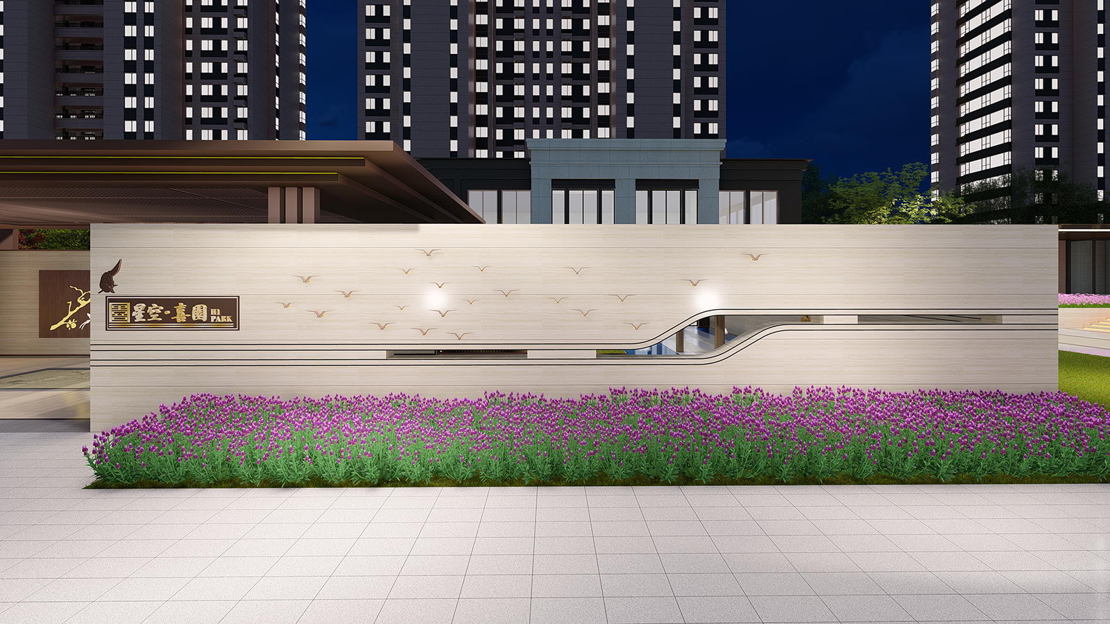 “百雀來迎” 景墻引導客戶進入示范區,示范區入口門頭與廊架相結合,金屬與石材完美契合,搭配浪漫花境自然優雅,大境盡攬。