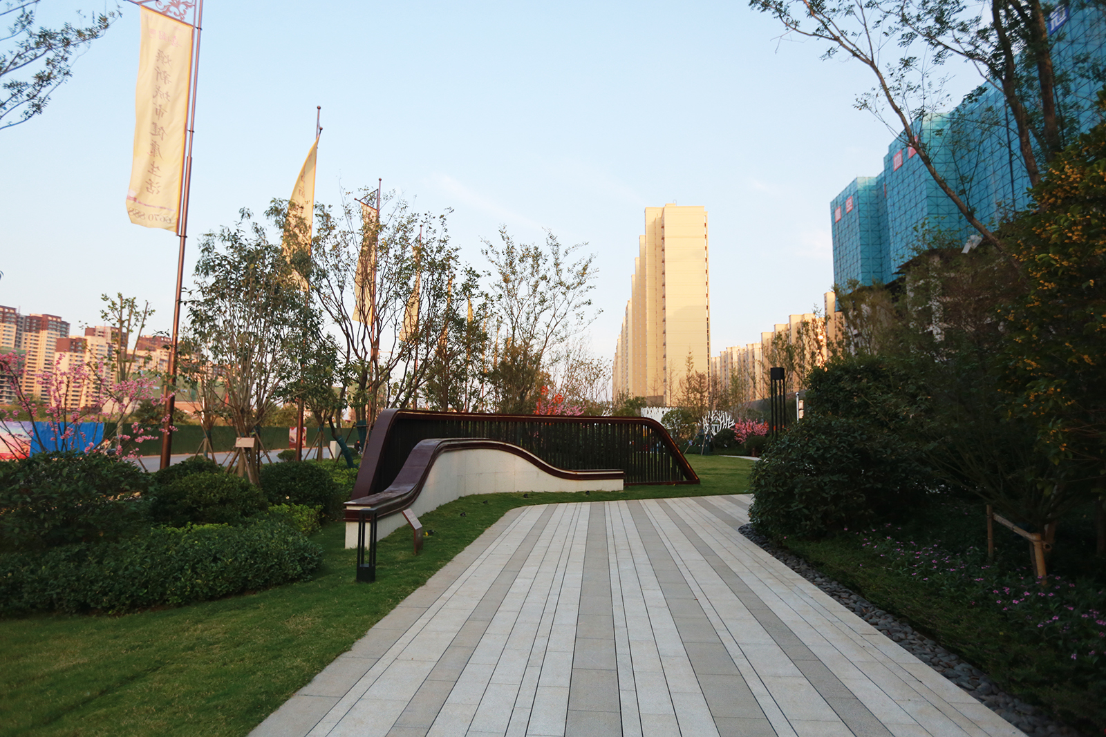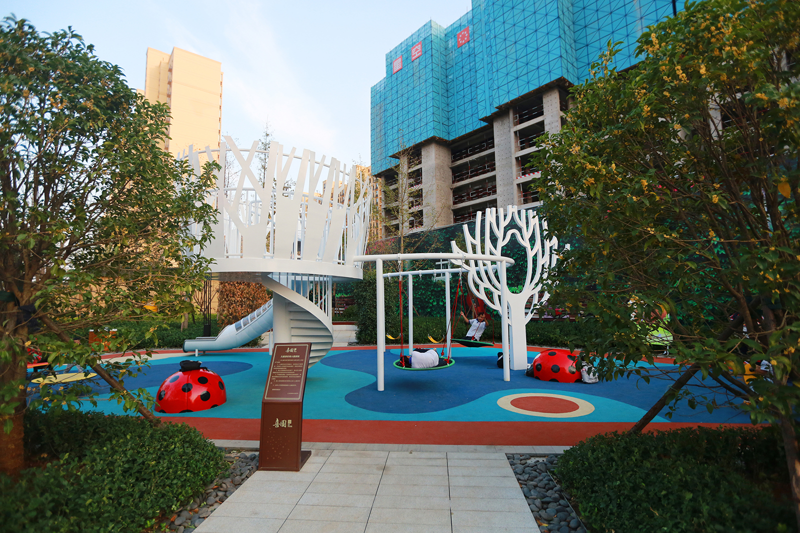 兒童樂園以親子同樂,喜鵲和鳴為意境,設置兒童體驗熱點,同時布置家長休閑看護區與洽談區,園路旁的喬木夾道種植,豐富的綠化層次,都能增強客戶對項目品質更加直觀的感受。