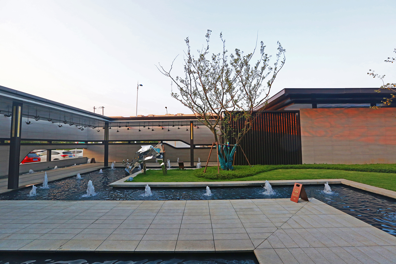 迎賓廣場平坦開闊,疊水水景與臺階組合現代、精致、優雅,水景布置有鵲歸巢主題雕塑,禮迎業主歸家,彰顯小區尊享品質。