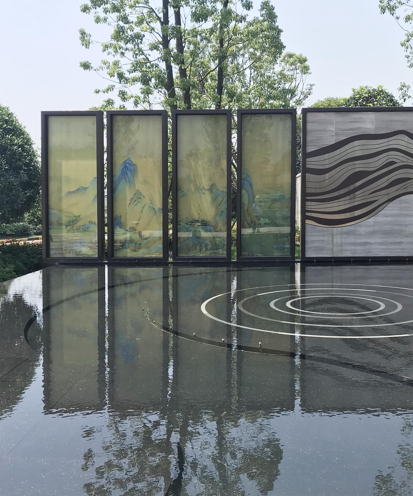 以真絲絹布打印青山綠水長軸,運用現代工藝,將絹畫夾在玻璃中間,中間景墻墻以高端法國木紋為背景,配合鋁板材質雕刻的山脈紋理,結合現代鏡面水景,利用朝夕的光影變化,仿佛古今交映,再現浩瀚江山壯美之境。