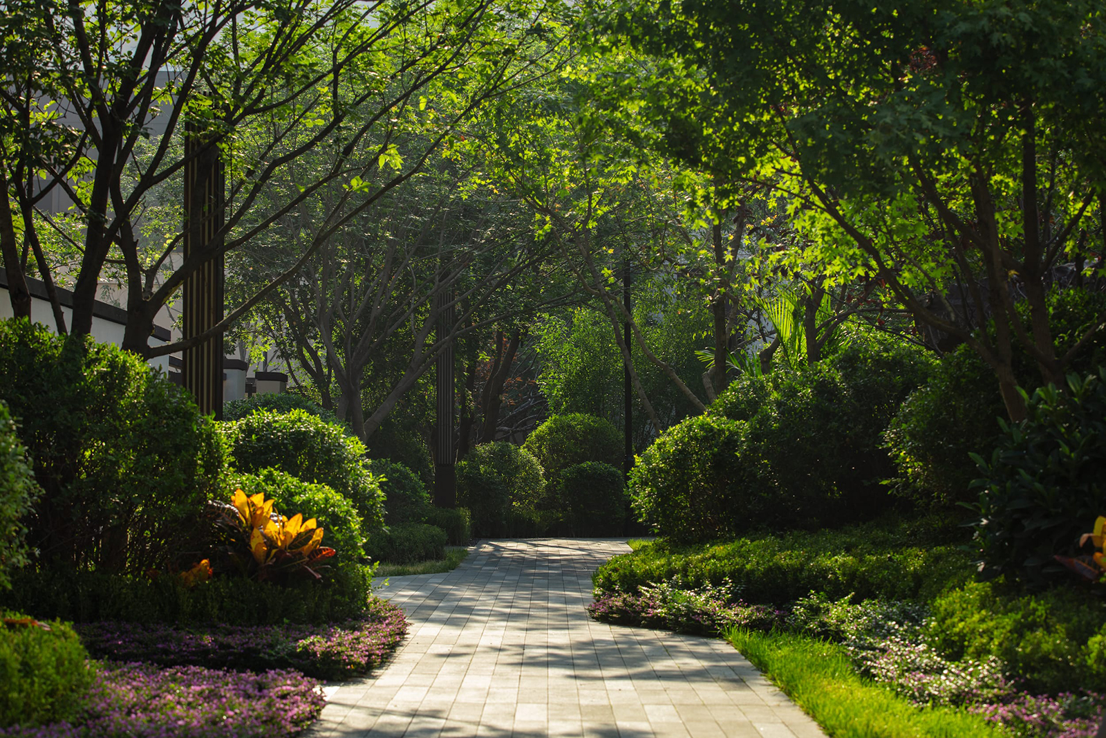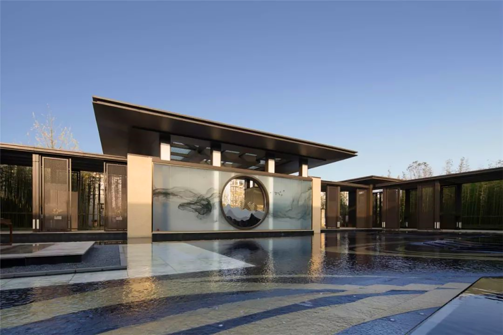 我們在傳統的一池三山枯山水基礎上,進行了創新,銅條追隨著山形,在湖石擺置之間,閃爍著迷人的光彩。 整個盛世華府秉承貴雅、輕奢國風設計元素,打造墨染閑庭的文學氣質,尊貴氣派的新人文院館。