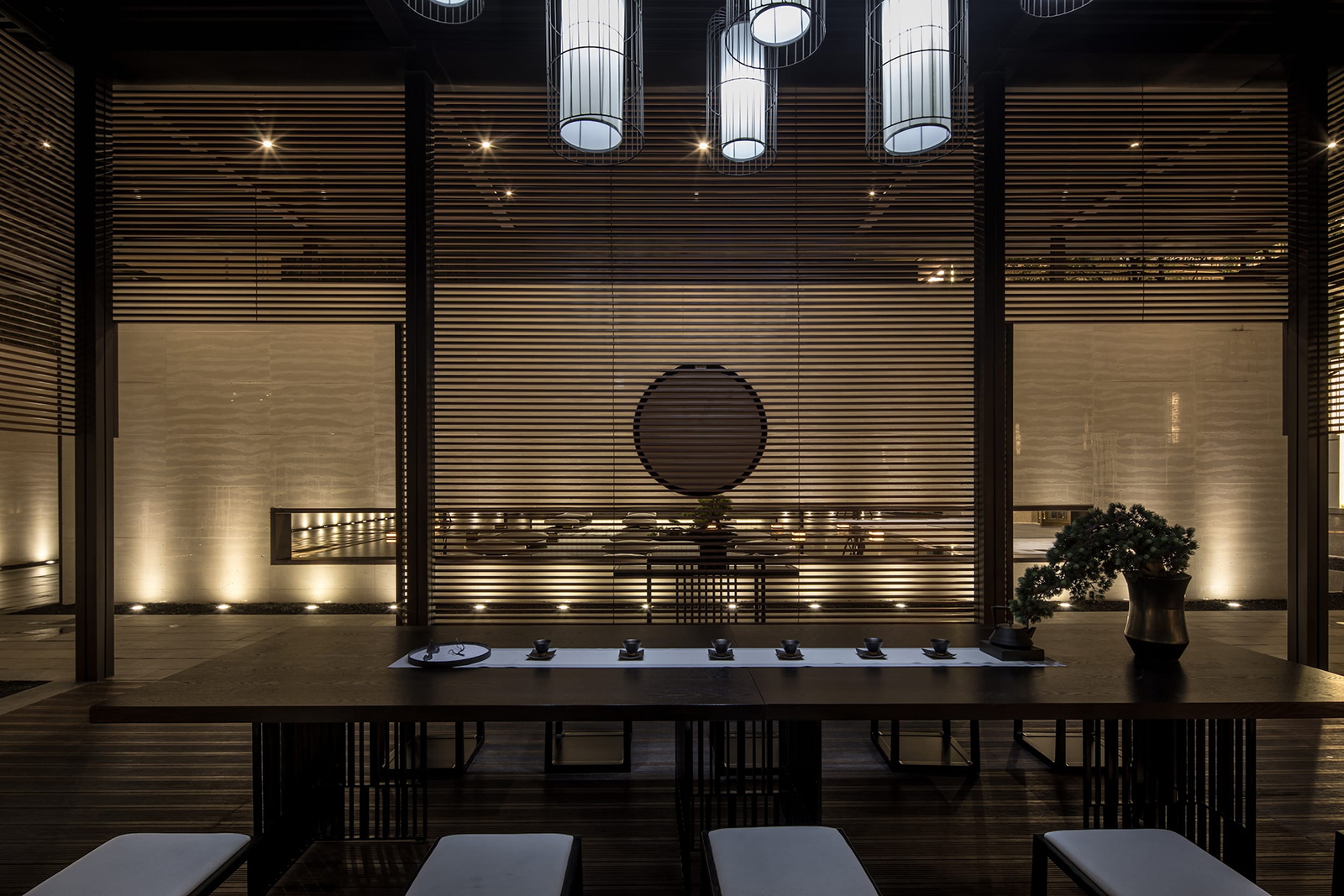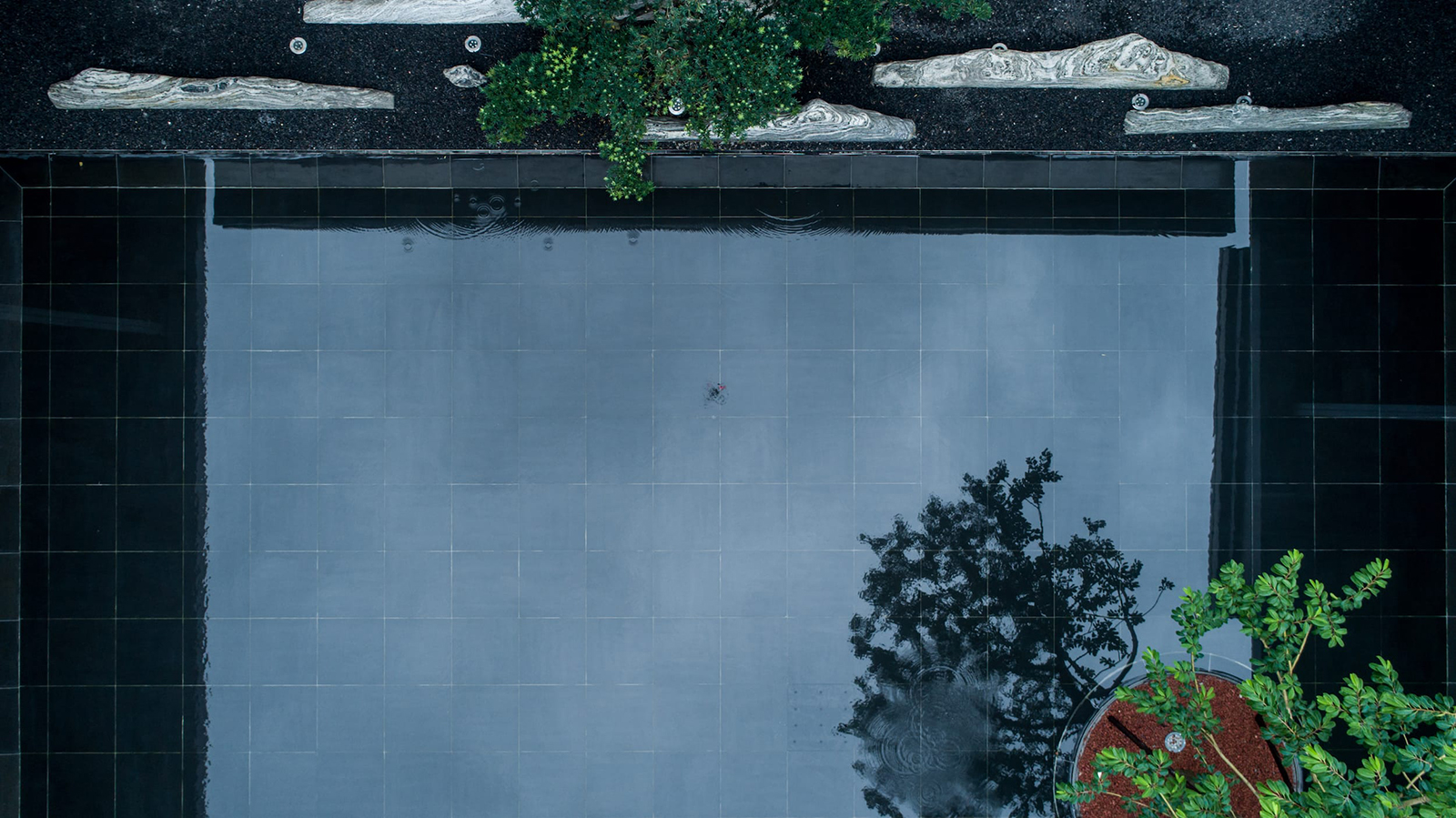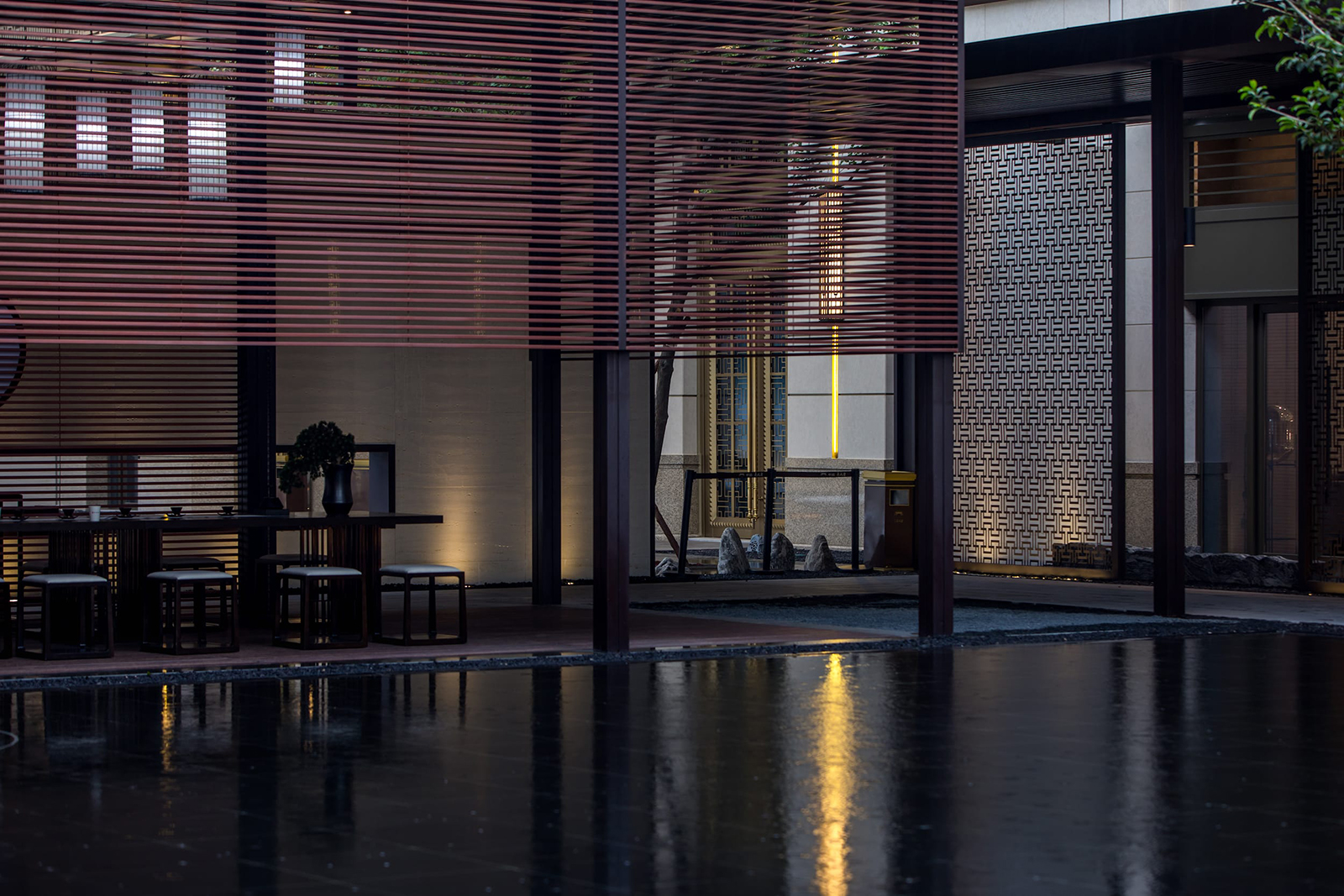 府院境的林泉是文人的林泉,將山水的形意融入到方寸的玉器上是古人表達喜愛的方式。西入口借助5.45米的內外高差,采用六寶歸家禮制,門頭、御燈、光階、疊水、照壁、三山六大景觀元素,禮溯一宅風水,規制禮儀,疊水瑯瑯如玉鳴,千里江山圖絹畫山水照壁,格柵之后設一池三山枯山水制境,兩側林蔭成趣,猶如境入山林,將臺、池、壁、光影等意境提煉、演化并植入場地,再現一幅具有文人林泉形意的現代山水畫卷。