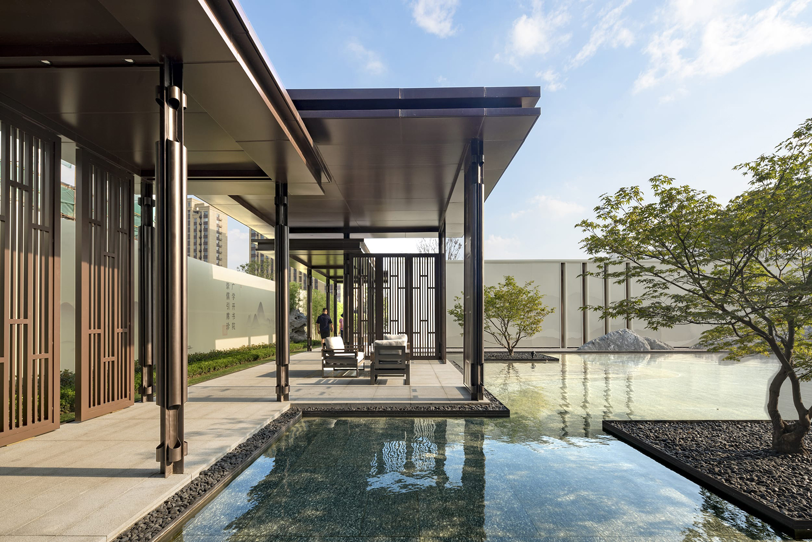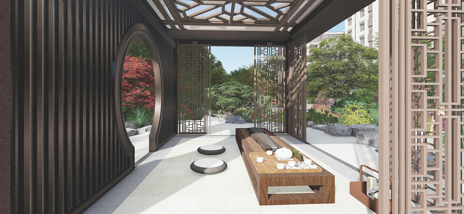 一軸、三進院,五大主題宅間景觀,以顯勢,迎客 、閑游、幸福悅居貫穿始終,采用現代、輕靈的中式設計手法 ,見徐東方意境元素 。