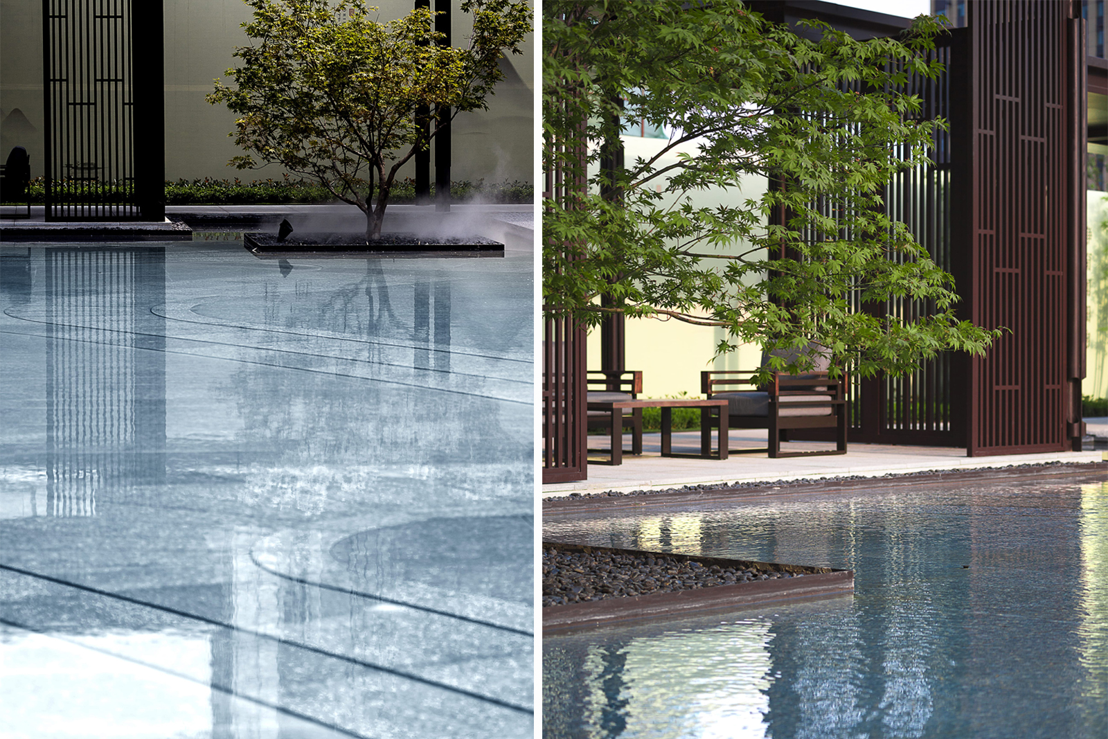“水利萬物而不爭”,入口府門與造型景石疏導人車動線,以“迎·入境壺天,禮·天宇空明——境·圖云境水”為展示序列,層層遞進。可所謂“入則壺天自春”,清凈悠然。對景景墻巍峨大氣,通過風雨連廊,見中軸線大尺度水景,如銀河望月,藏風納氣。水景曲線如群山往復,流水潺潺,禮儀燈光步道,靜謐舒心,大氣、精致、從容。